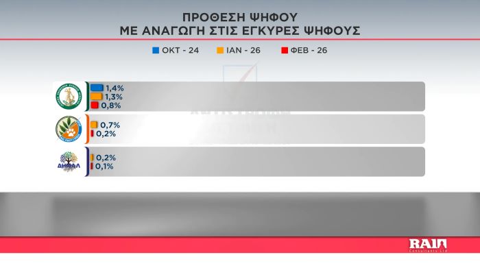 Από εκεί και πέρα, το ΑΛΜΑ προηγείται στη μάχη της τέταρτης θέσης, ενώ ακολουθεί το ΔΗΚΟ το οποίο ξεπέρασε σε ποσοστά την ΑΜΕΣΗ ΔΗΜΟΚΡΑΤΙΑ, του Φειδία Παναγιώτου.