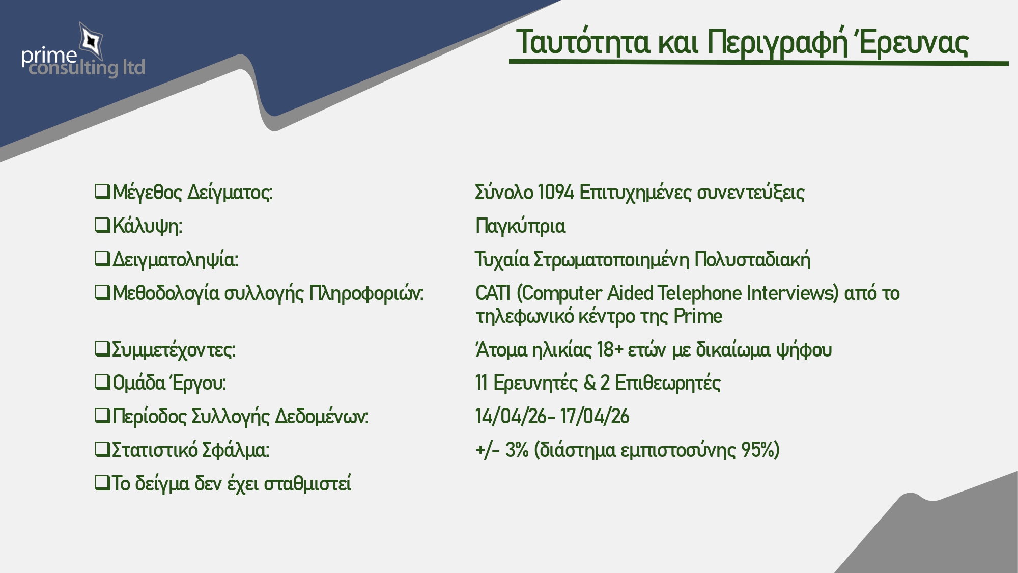 Η νέα δημοσκόπηση της Prime Consulting για την εκπομπή «Χωρίς Περιστροφές», με δείγμα 1.094 ατόμων και περίοδο συλλογής στοιχείων 14 έως 17 Απριλίου 2026, αποτυπώνει ένα πολιτικό σκηνικό έντονης απογοήτευσης, χαμηλής ικανοποίησης προς την κυβέρνηση και αμφίρροπη μάχη κορυφής μεταξύ ΔΗΣΥ και ΑΚΕΛ.