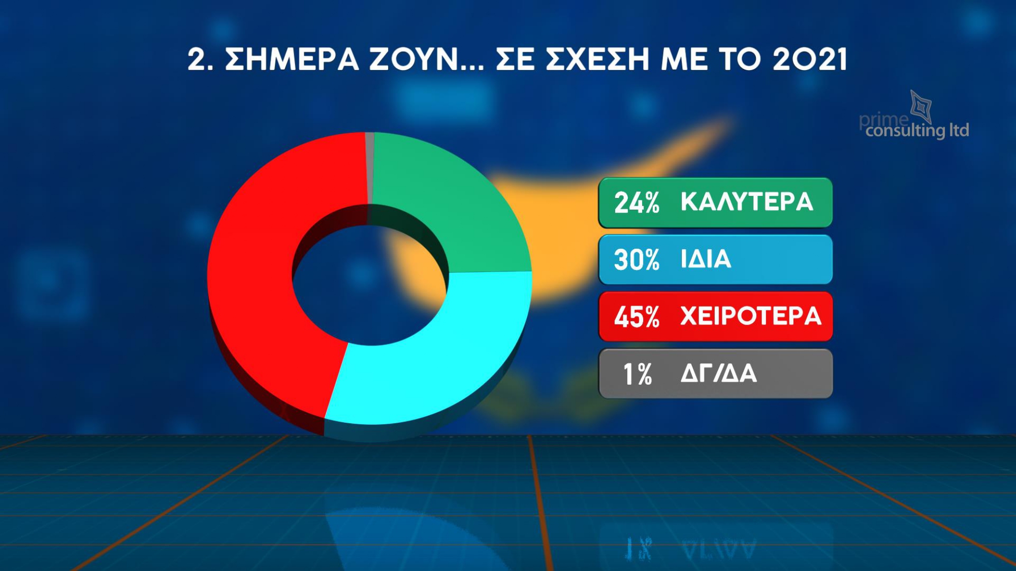 Στο ερώτημα για το αν οι πολίτες ζουν σήμερα καλύτερα σε σχέση με το 2021, το 45% απαντά χειρότερα, το 30% ότι ζει το ίδιο καλά και μόλις το 24% θεωρεί ότι ζει καλύτερα. Πρόκειται για σαφή ένδειξη κοινωνικής δυσαρέσκειας ως προς την πορεία της καθημερινότητας και της οικονομίας.