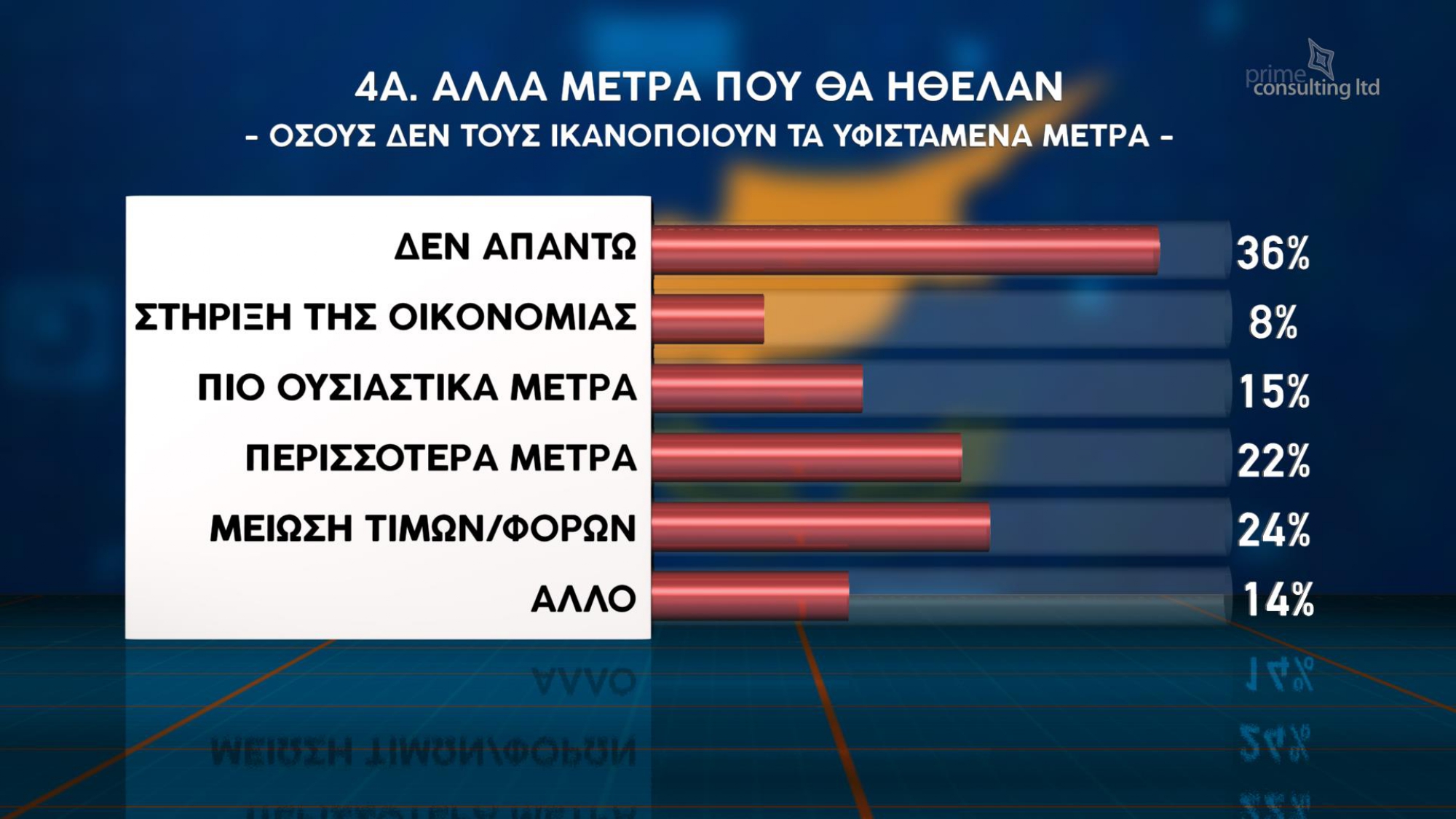 Ανάλογη εικόνα προκύπτει και για τα οικονομικά μέτρα λόγω πολέμου. Το 49% δηλώνει ότι δεν ικανοποιείται, έναντι 38% που δηλώνει ικανοποιημένο, ενώ 13% δεν εκφράζει γνώμη. Μεταξύ όσων απορρίπτουν τα μέτρα, το 24% ζητά μείωση τιμών και φόρων, το 22% περισσότερα μέτρα και το 15% πιο ουσιαστικές παρεμβάσεις.