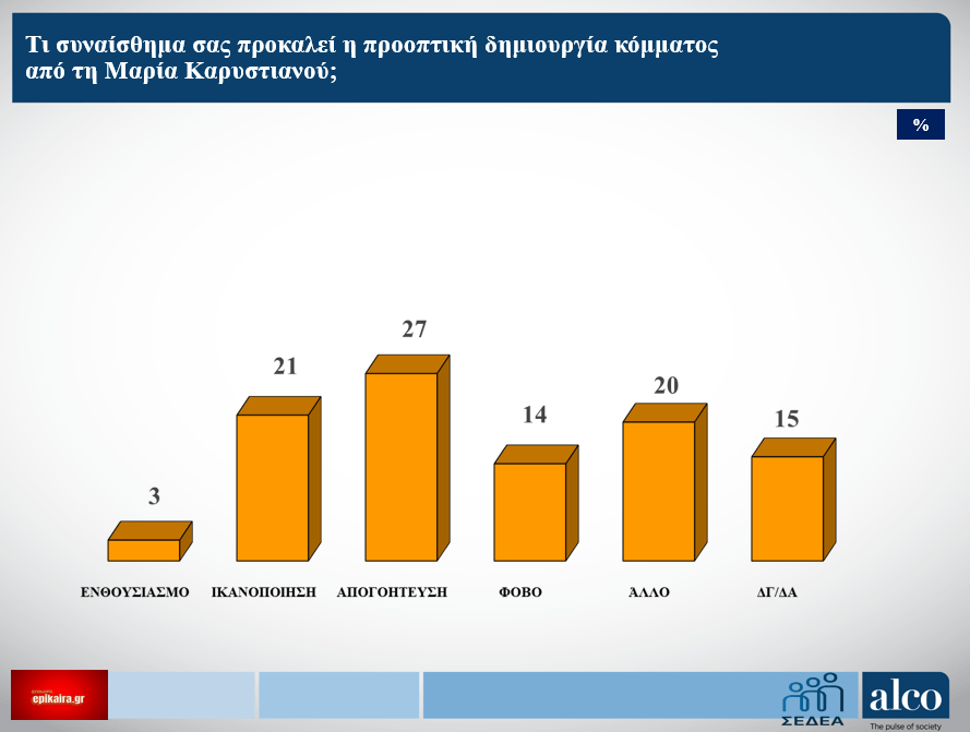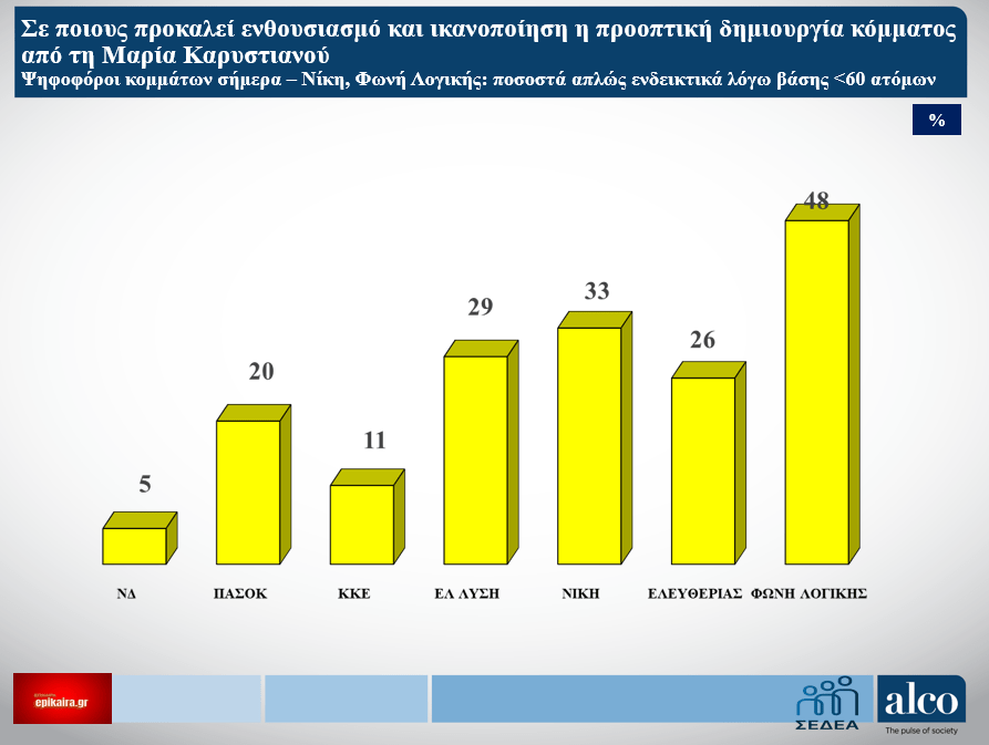 Στους σημερινούς ψηφοφόρους των κομμάτων το ενδεχόμενο δημιουργίας κόμματος από τη Μαρια Καρυστιανου αντιμετωπίζει θετικά το 5%των ψηφοφόρων της ΝΔ, το 20% του ΠΑΣΟΚ, το 11% του ΚΚΕ, το 29% της ΕΛΛΗΝΙΚΗΣ ΛΥΣΗΣ, το 33% της ΝΙΚΗΣ, το 26% της ΠΛΕΥΣΗΣ ΕΛΕΥΘΕΡΙΑΣ , το 48% της ΦΩΝΗΣ ΛΟΓΙΚΗΣ και το 16,5% αυτών που σήμερα δηλώνουν των ΑΝΑΠΟΦΑΣΙΣΤΟΙ.