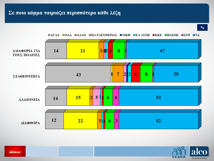 Στο πεδίο των ποιοτικών χαρακτηριστικών, τα δεδομένα είναι εξίσου αποκαλυπτικά. Η έννοια της «σταθερότητας» εξακολουθεί να συνδέεται σε σημαντικό βαθμό με τη ΝΔ, όμως μόνον το 64,5% των πρώην ψηφοφόρων της διατηρεί αυτή τη σύνδεση. Η φθορά είναι εμφανής. Ακόμη πιο βαρύ είναι το εύρημα γύρω από τη λέξη «διαφθορά»: το 52% του συνόλου των πολιτών τη συσχετίζει με τη ΝΔ, ενώ στην ηλικιακή ομάδα 25–44 το ποσοστό εκτινάσσεται στο 63%. Το γεγονός ότι το 25% των πρώην ψηφοφόρων της ΝΔ συνδέει επίσης τη «διαφθορά» με το ίδιο το κόμμα, υποδηλώνει διάβρωση της ηθικής αξιοπιστίας του.