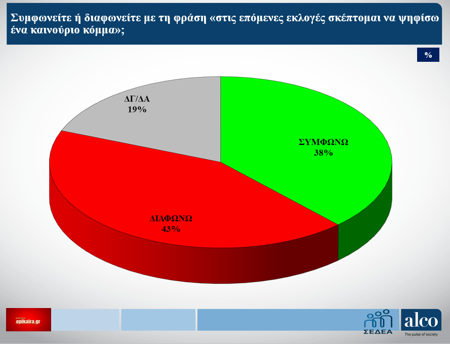 Στο ίδιο πλαίσιο εντάσσεται και το εύρημα ότι το 38% των πολιτών σκέφτεται να ψηφίσει ένα νέο κόμμα, ποσοστό που στις γυναίκες φθάνει το 43% και στην ηλικιακή ομάδα 25–44 το 49%. Πρόκειται για σχεδόν έναν στους δύο νέους και μεσαίας ηλικίας ψηφοφόρους. Επιπλέον, το 27,5% των πρώην ψηφοφόρων της ΝΔ και το 30,5% των πρώην ψηφοφόρων του ΠΑΣΟΚ δηλώνουν ανοικτοί σε μια νέα πολιτική επιλογή. Η τάση αυτή δεν είναι απλή διαμαρτυρία· συνιστά ένδειξη αναζήτησης δομικής ανανέωσης του πολιτικού σκηνικού.