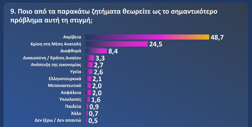 Σύμφωνα με τα ευρήματα, η Ακρίβεια παραμένει με διαφορά το σημαντικότερο πρόβλημα, συγκεντρώνοντας ποσοστό 48,7%, επιβεβαιώνοντας τη συνεχιζόμενη πίεση που δέχονται τα νοικοκυριά. Την ίδια ώρα, η κρίση στη Μέση Ανατολή απασχολεί το 24,5% των ερωτηθέντων, με την ανησυχία να συνδέεται κυρίως με τις οικονομικές επιπτώσεις και την επίδραση των διεθνών εξελίξεων στην καθημερινότητα των πολιτών.