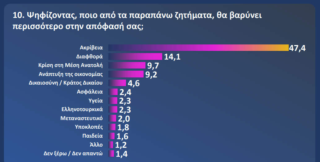 Παρόμοια εικόνα αποτυπώνεται και στο ερώτημα για το ποιο ζήτημα θα επηρεάσει την ψήφο τους στις εκλογές: η Ακρίβεια προηγείται με 47,4%, ακολουθεί η Διαφθορά με 14,1%, ενώ η Υγεία συγκεντρώνει μόλις 2,3%, επιβεβαιώνοντας την υποχώρησή της ως κεντρικό πολιτικό διακύβευμα.