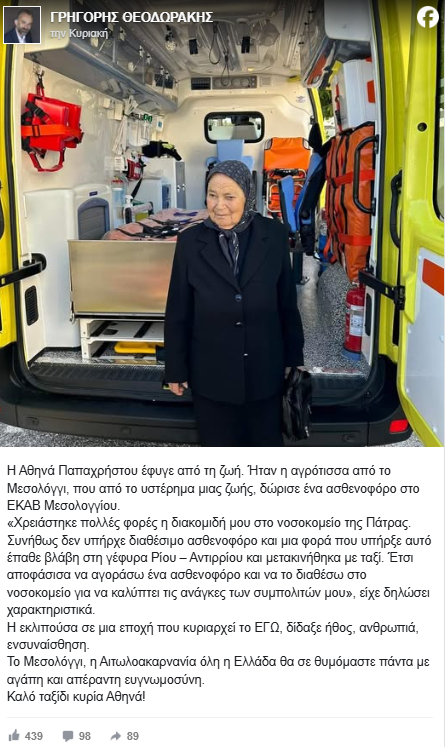 Η Αθηνά Παπαχρήστου έφυγε από τη ζωή. Ήταν η αγρότισσα από το Μεσολόγγι, που από το υστέρημα μιας ζωής, δώρισε ένα ασθενοφόρο στο ΕΚΑΒ Μεσολογγίου.
